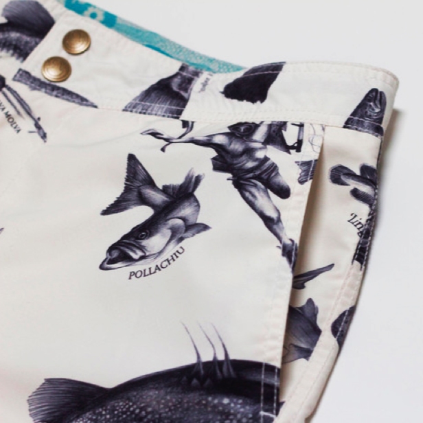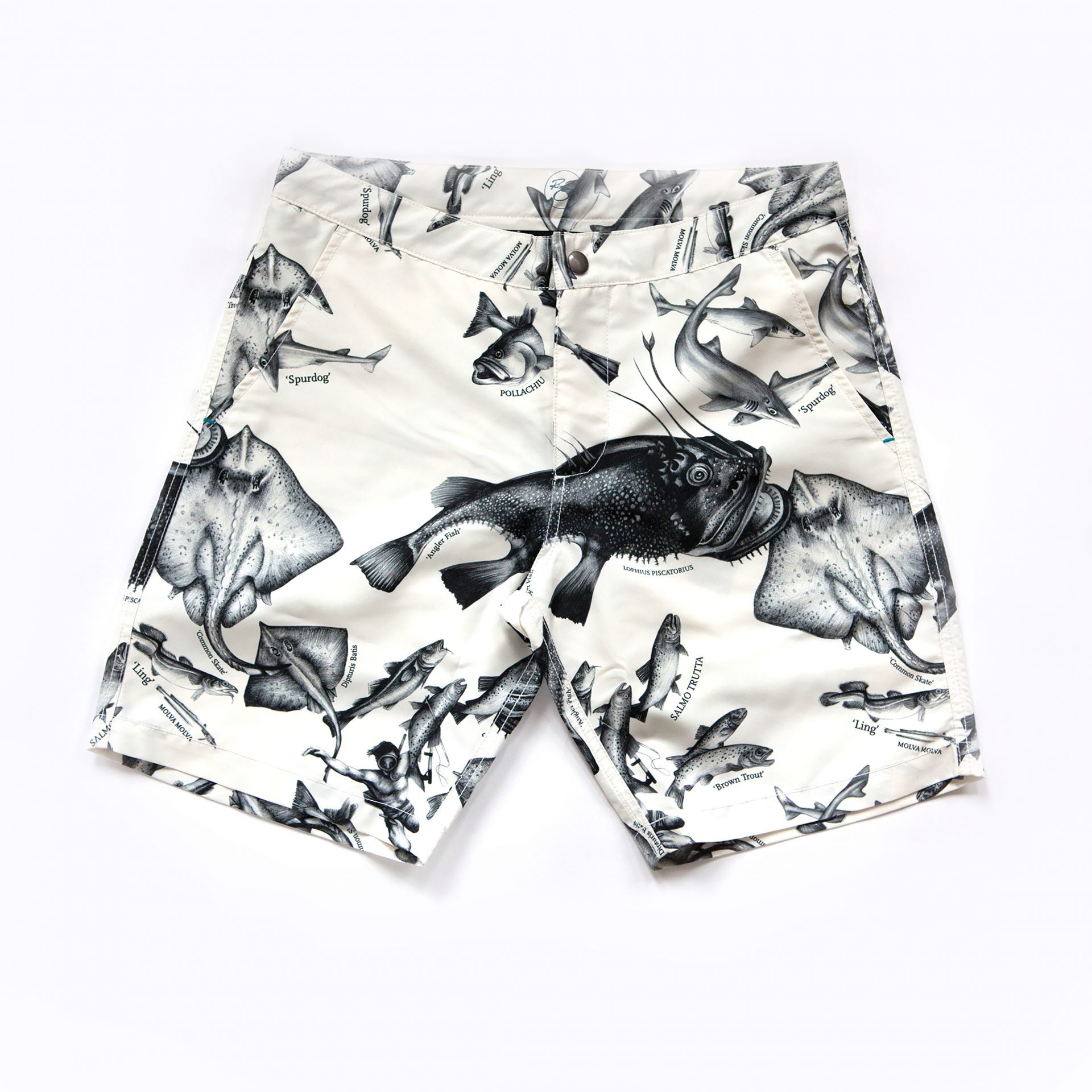 Riz Boardshorts are a company with sustainability in mind. All their shorts are made out of 100% recycled and recyclable polyester, which start life as plastic bottles or food containers that are then crushed, shredded and wound into fabric. They commissioned me to create a textile that represented their ethos. I chose a theme based on endangered species of fish in the UK waters.